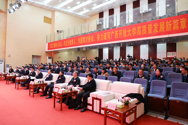 自治区政府办公厅,自治区党委编办,自治区发改委、财政厅、人社厅、农业农村厅、退役军人事务厅,自治区总工会、自治区社科联、自治区科协,南宁市五象新区管委会、南宁教育园区建设指挥部等自治区、南宁市相关单位的领导和嘉宾,广西师范大学、广西财经学院、桂林航天工业学院、广西教育学院等兄弟院校的领导和嘉宾,学校历任老领导和离退休教职工代表,学校现任领导,各市分校的书记、校长和师生代表,以及新闻媒体记者出席仪式。(摄影:郭昱轩)