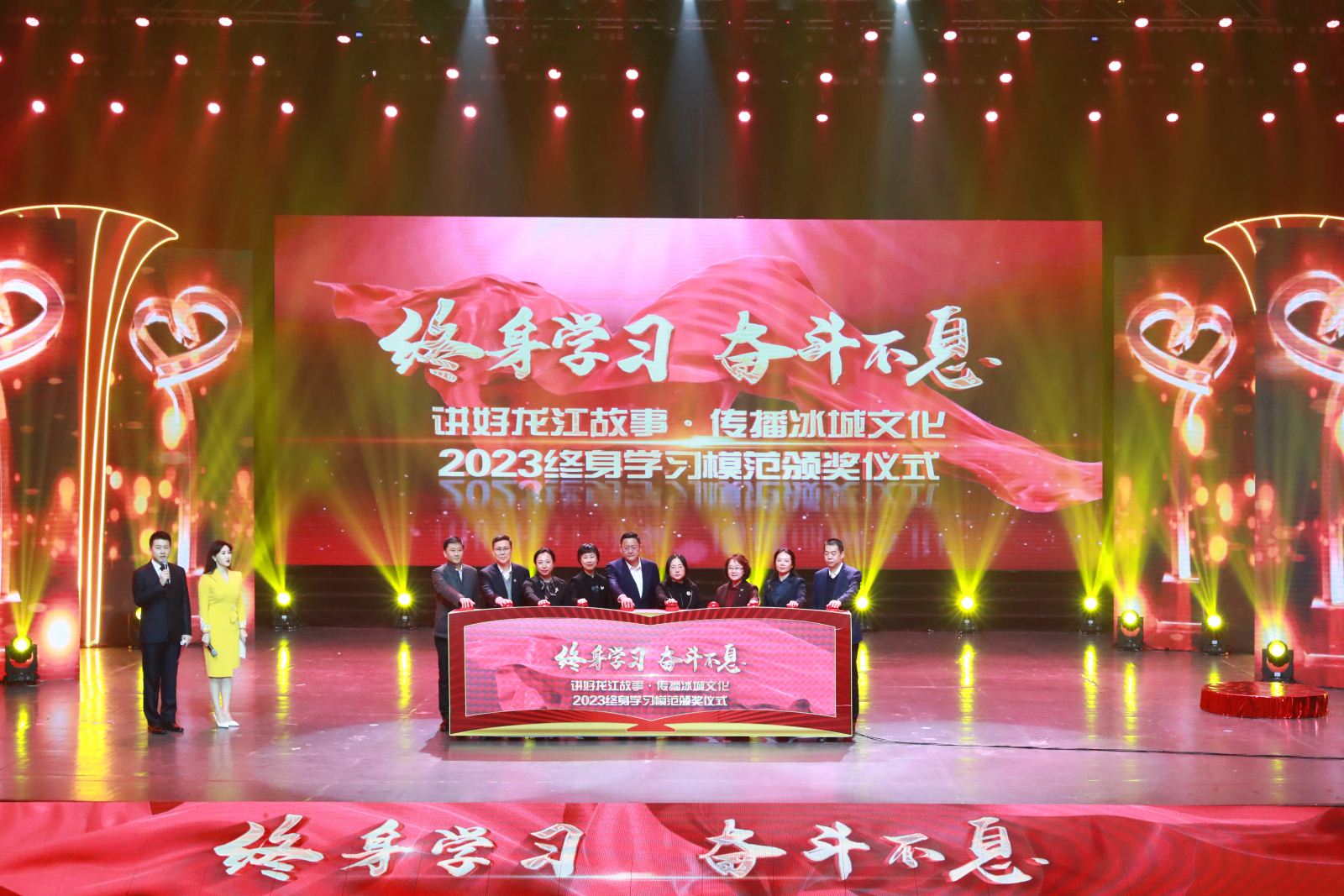 颁奖仪式的最后,谭乐伟、张荣华、市委统战部副部长胡松涛、市妇联主席尚瑞、市社科联党组书记王葳、哈尔滨老年人大学党组书记丛肖南、哈尔滨开放大学校长白宝彦、市残联副理事长李继武、哈尔滨市职教社副秘书长,市教育局一级调研员邓向伟在仪式现场点亮终身学习之光,倡导向榜样看齐,向模范致敬,讲好龙江故事,传播冰城文化,在新征程上贡献学习和奋斗的力量。