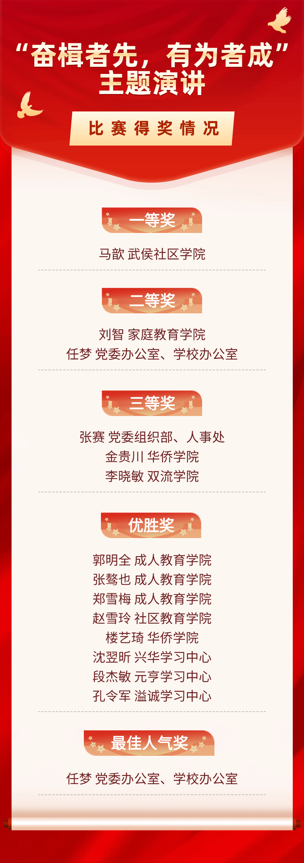 他立足“幸福成都”和“立园满园”等城市发展目标,围绕建强队伍、建成机制、建好学校三大愿景,描绘了学校未来的发展蓝图,激励全体教职工将比赛激发的热情转化为笃行不怠的动力,共同以“奋楫者”的姿态和“有为者”的抱负,为成都开放大学的高质量发展共创未来。