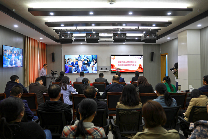 4月9日下午,国家开放大学江苏分部思想政治教学工作视频会议在江苏开放大学定淮门校区云教室召开。国家开放大学党委副书记刘臣到会指导,江苏开放大学党委书记王建明出席会议并讲话,会议由江苏开放大学校长崔新有主持。江苏开放大学校党委副书记、副校长金丽霞、副校长张益彬出席会议。江苏开放大学党办、宣传部负责人,国家开放大学江苏分部教学管理中心相关人员,各市、县(市、区)开放大学主要负责人、分管校领导、国开业务部门负责人、思政课辅导教师代表近300人参加了会议。