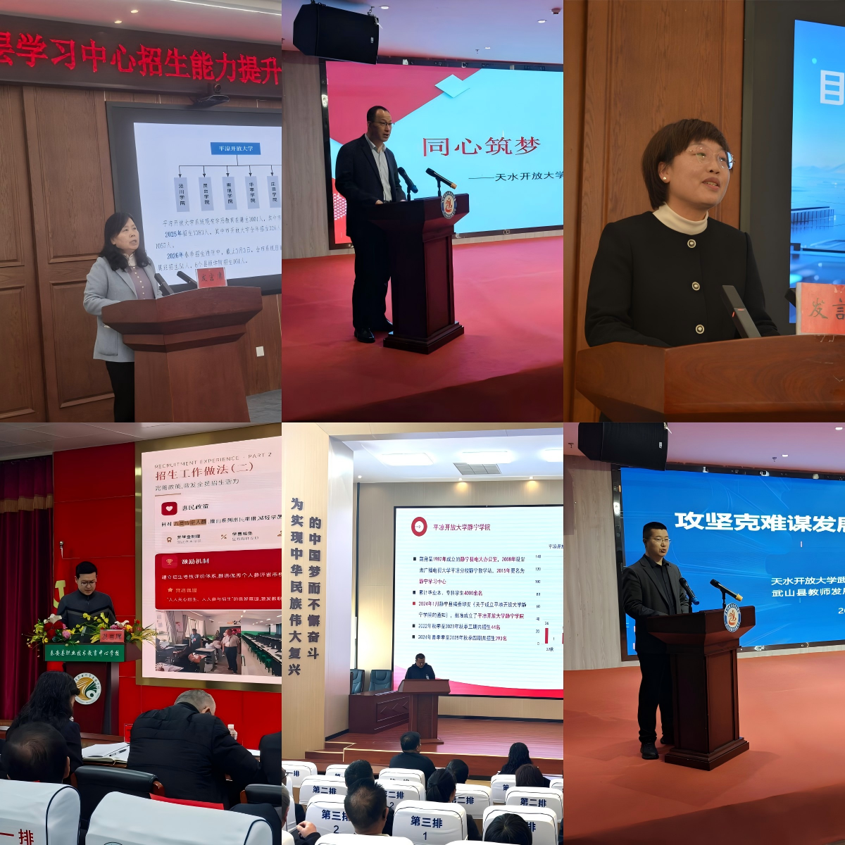 为破解招生发展难题,切实提升基层学习中心招生工作能力,凝聚全省办学体系工作合力,3月6日至8日,甘肃开放大学基层学习中心招生能力提升专项培训在平凉庄浪、静宁,天水秦安、武山等地举办。学校党委委员、副校长丁霞参加活动并讲话,庄浪县委常委、宣传部部长张芸,武山县副县长高峰出席并致辞;静宁县副县长李宇及静宁、秦安等四县教育主管部门相关领导出席现场活动。相关市(州)开放大学、县级学院(学习中心)校领导、招生负责人及省校招生办公室工作人员50余人参加培训。