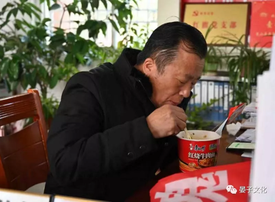 晏乃军再次回到村部已经过了午饭时间,其他村干部正在汇总上午走访和疫情防控情况。晏乃军拿起一份泡面、冲上开水:“这东西开始吃还觉得有味,顿顿吃就不香了,还是老伴做的饭菜香。”