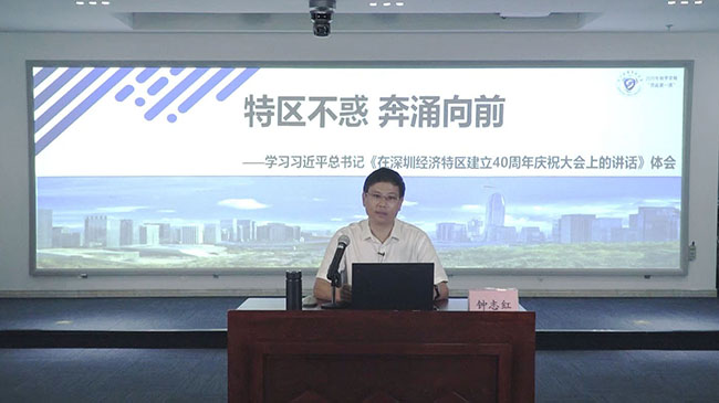 钟志红围绕习近平总书记在庆祝大会上总结的40年来深圳实现的5大历史性跨越,通过一段段鲜活的历史和一组组详实的数据,深情回顾了深圳经济特区发展的昨天、今天和明天,生动描绘了40年来深圳勇立潮头创奇迹的美丽画卷。他强调,习近平总书记在庆祝大会上总结的经济特区40年改革开放、创新发展积累的10条宝贵经验,对新时代经济特区建设具有重要指导意义,我们必须倍加珍惜,长期坚持,在实践中不断丰富和发展。