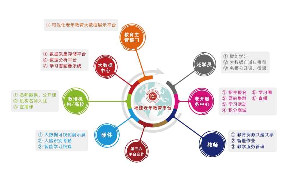 案例《基于大数据分析的老年教育公共服务平台》为福建老年开放(互联网)大学体系试点办学提供应用支持服务,集“教、学、评、管、展”等功能于一体,包含在线课程、招生教务、师资调配、活动支持、新闻动态、学习地图、线上直播、会议管理等,创新实现线上线下相结合的混合教学模式,实现电视端、手机端、PC端同步推送,目前已开通成立69家分平台,通过平台组织了乐学敬老、有奖竞学以及摄影、英语口语等线上竞赛学习活动。疫情期间,平台直播模块的“停课不停学”吸引了12万人次的老年学习者加入。平台操作简便,技术框架科学合理,应用模式成熟,具备可复制性和示范推广性。