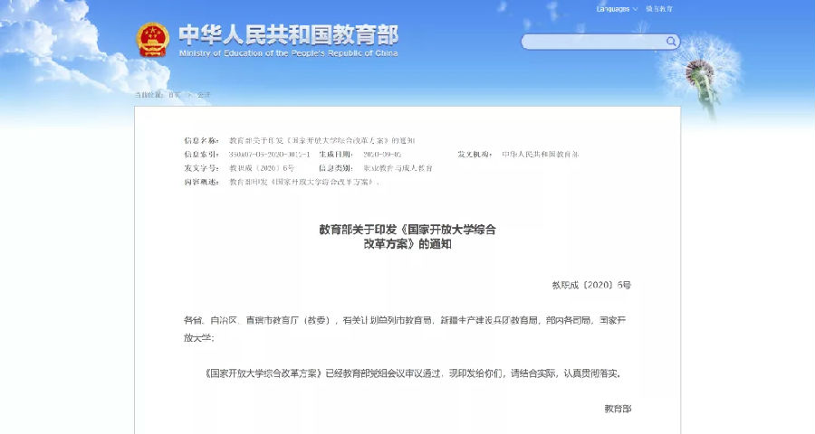 据了解,2012年,根据《国务院办公厅关于国家教育体制改革试点的通知》部署,教育部相继批复北京、上海、江苏、广东、云南5所省级广播电视大学更名为地方开放大学。