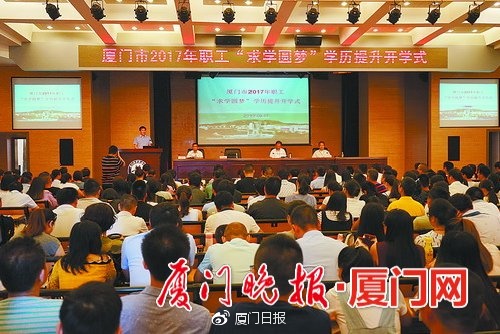 帮助职工提升学历,还给每名符合条件的学员至少4000元的补助(其中市总工会补贴3000元,厦门广播电视大学补贴1000元,还有用人单位根据实际情况补助),昨日上午,由市总工会和市教育局举办的2017年职工“求学圆梦”学历与能力提升行动在厦门城市职业学院举行开学仪式。首批有600多名职工参加了新生开学式。
