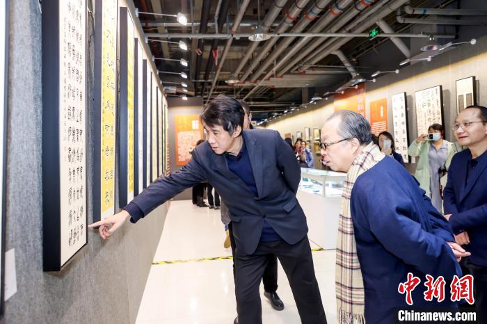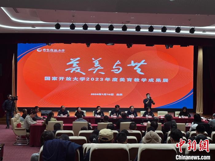 1月16日,“美美与共”国家开放大学2023年度美育教学成果展开幕,与会人员观看成果展。国家开放大学 供图