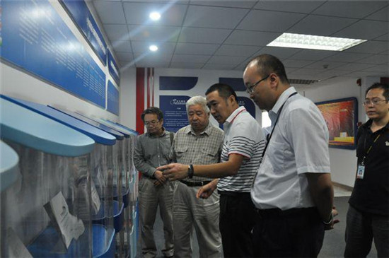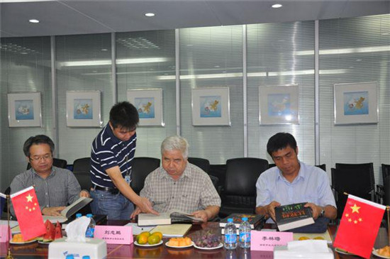 北大青鸟APTECH副总裁陈峰波(左二)向高等教育出版社社长刘志鹏(右二)、国家开放大学副校长李林曙(右一)、国家开放大学科研处处长孙福万(左一)等介绍北大青鸟APTECH标准化手册。