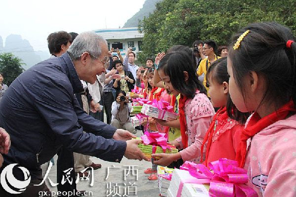 5月7日,致公党中央与国家开放大学共80多人向大新县堪圩乡谨汤村小学捐赠530余册书籍,涉及科普、文学、艺术、历史等领域课外读物,总价值为10000元,并勉励该校全体学生多读书、读好书,做有知识、有理想的新一代接班人。图为捐赠现场。(2014-05-08人民网)