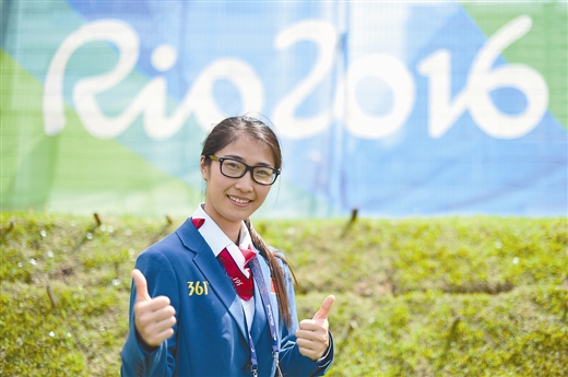 9月5日,荣静在里约残奥会运动员村举行的中国体育代表团升旗仪式结束后留影。新华社发