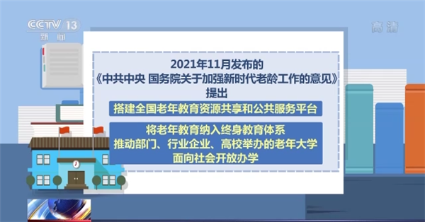 2021年11月发布的《中共中央 国务院关于加强新时代老龄工作的意见》提出,搭建全国老年教育资源共享和公共服务平台;将老年教育纳入终身教育体系,推动部门、行业企业、高校举办的老年大学面向社会开放办学。