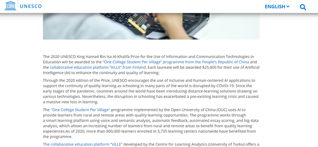 联合国教科文组织指出,中国国家开放大学实施的“一村一名大学生”计划使用人工智能为农村和偏远地区的学习者提供优质学习机会。该计划依托智能学习平台,通过语音和语义分析、自动反馈、自动文章评分和大数据分析,使越来越多的农村和偏远地区的学习者可以获得优质学习体验。