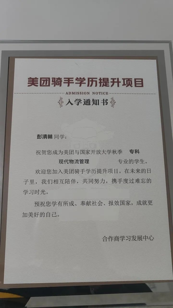 社会各界对他的褒奖纷至沓来其中就包括彭清林所在的外卖平台与国家开放大学联合推出的“骑手上大学”项目给予了彭清林免费上大学的机会