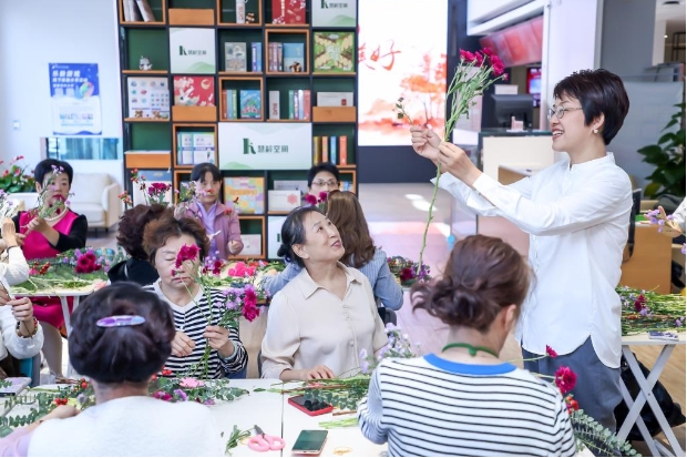 在国家老年大学魏公村校区课堂上,老师黄山正在讲授插花课程。(国家老年大学供图)