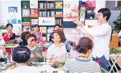 此外,老师还鼓励学员在课堂之外参与社交互动和公开演出,将课堂所学融入生活之中,从“文化养老”到“老有所为”。滕军每次上完插花课都会去花市买些花材回家练手,不仅为自己增添生活情趣,还主动为楼道进行花艺布置。“有些访客一到我们单元就说这里太漂亮了。”她说,能为大家服务的感觉非常好。