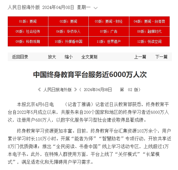 终身教育学习资源更加丰富。目前,终身教育平台汇集资源103万余个,用户累计学习时长110万小时。开展“能者为师”“智慧助老”专项行动,开放共享近8万门优质微课;推出“全民阅读、书香中国”线上学习活动专区,上线超过1万本电子书。此外,在特殊人群使用方面,平台上线了“关怀模式”“长辈模式”,满足适老化和无障碍用户学习需求。