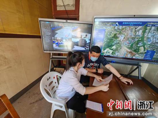田熊英(女)正在和村党委委员周立峰商量各个防疫点位的人员安排。 浙江开放大学 提供