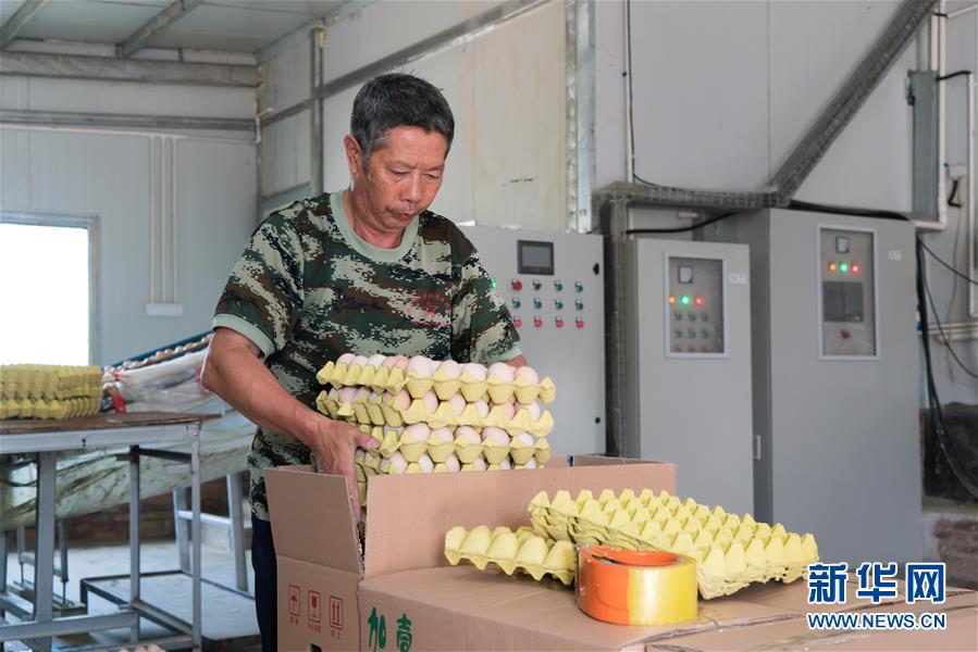 如今,肖石军的蛋鸡养殖场扩大了规模,蛋鸡年存栏量能达13万只。现存栏的8万余只每天出场鸡蛋7万余枚。同时,肖石军还结合当地实际,与农户开展合作,收购农户为蛋鸡养殖所种植的药材等农副产品,开办土鸡养殖。肖石军被村民们称为“创业能手”“致富带头人”。(2018-08-16新华网摄影:新华社记者万志云)