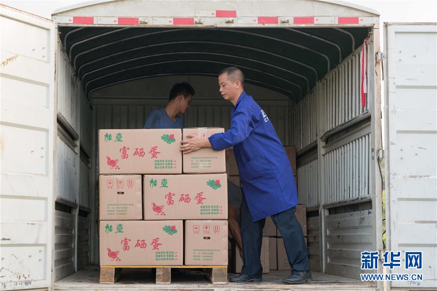 肖石军(右)与工作人员将包装好的鸡蛋装上货车,准备运往附近县城的销售点