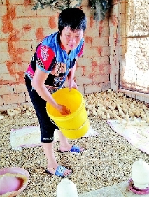 湖南省衡山县长江镇麻塘村三黄鸡养殖带头人陈春香正在给小鸡添食。
