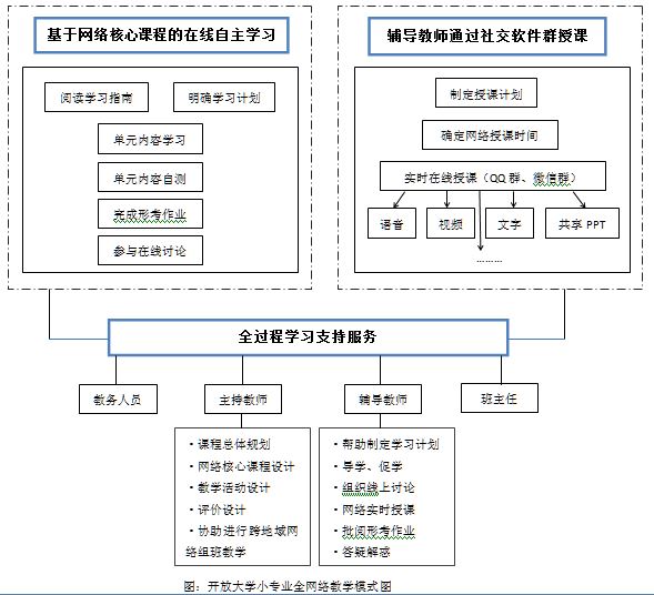 本文试图借鉴SPOC理念,同时适应新的网络学习环境的特点,重新构建开放大学小专业全网络教学模式。如下图所示: