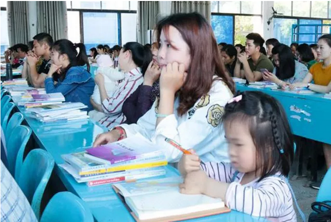课堂上,有2位特殊的“学生”吸引了不少人的目光:一个愣头愣脑的小男孩,一位斯斯文文的小姑娘,他俩陪着各自的母亲,也坐在座位上,小男孩充满好奇地抓着妈妈新领的书,小姑娘有模有样地拿着铅笔在本子上写写画画。“提孩巧相如”的年纪,在380多人的大教室里,居然不吵也不闹,十分乖巧。