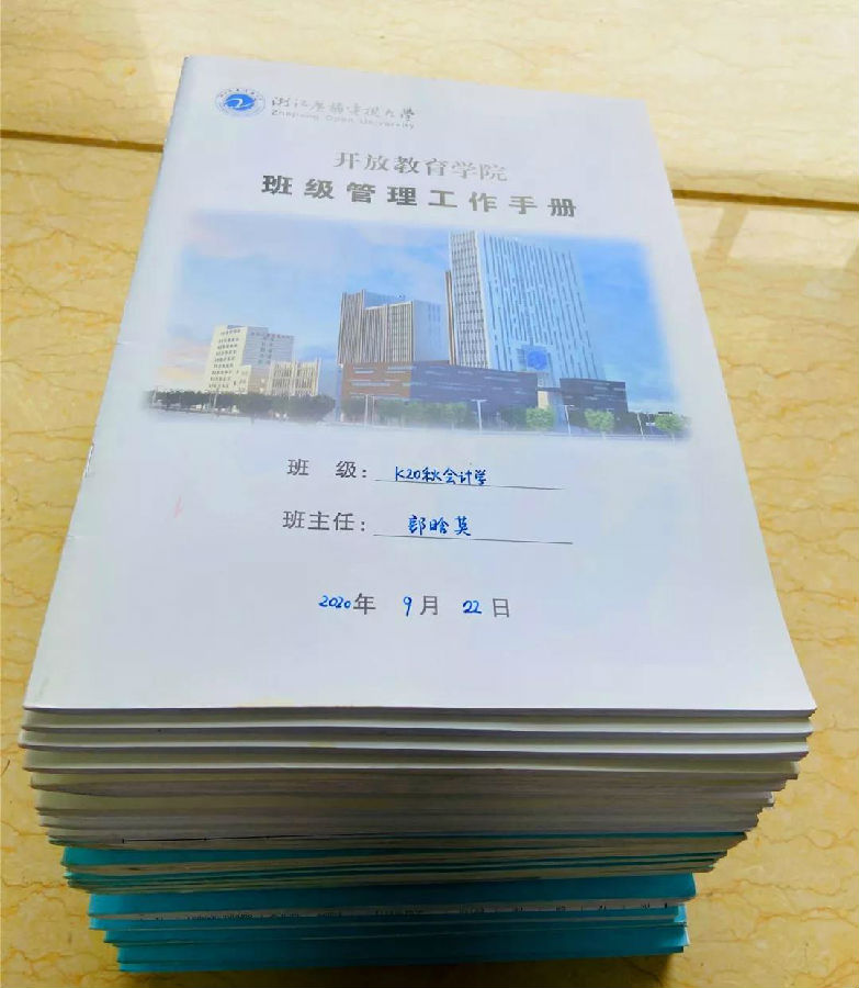 班主任工作最大的特点就是“繁琐”。尤其是开放教育学生都是在职人员,工学矛盾是学生必须处理的首要问题。班级课程注册、教材领取、学生网上作业、课程考核、学生成绩、谈心谈话等情况,都详细记录在了她的班级管理工作手册上。三年间,她用了近30个工作手册,叠起来厚度近20厘米。开放教育学生的学习内容大多通过线上完成,加上忙于工作,郭晗英与学生见面的时间往往很少。“刚开始工作时,因为跟学生见面不多。有一次学生突然来学校找我,我一时间都叫不出学生名字,更别说对学生情况的了解了,当时觉得很惭愧……”她这样描述曾经的“愧疚事”。此后,她通过微信、电话等形式与学生沟通,了解学生的基本信息,并将学生的照片做成“相册”。每天看照片写名字,“这样就能够认识每一位同学,不会出现叫不出学生名字的尴尬了”。