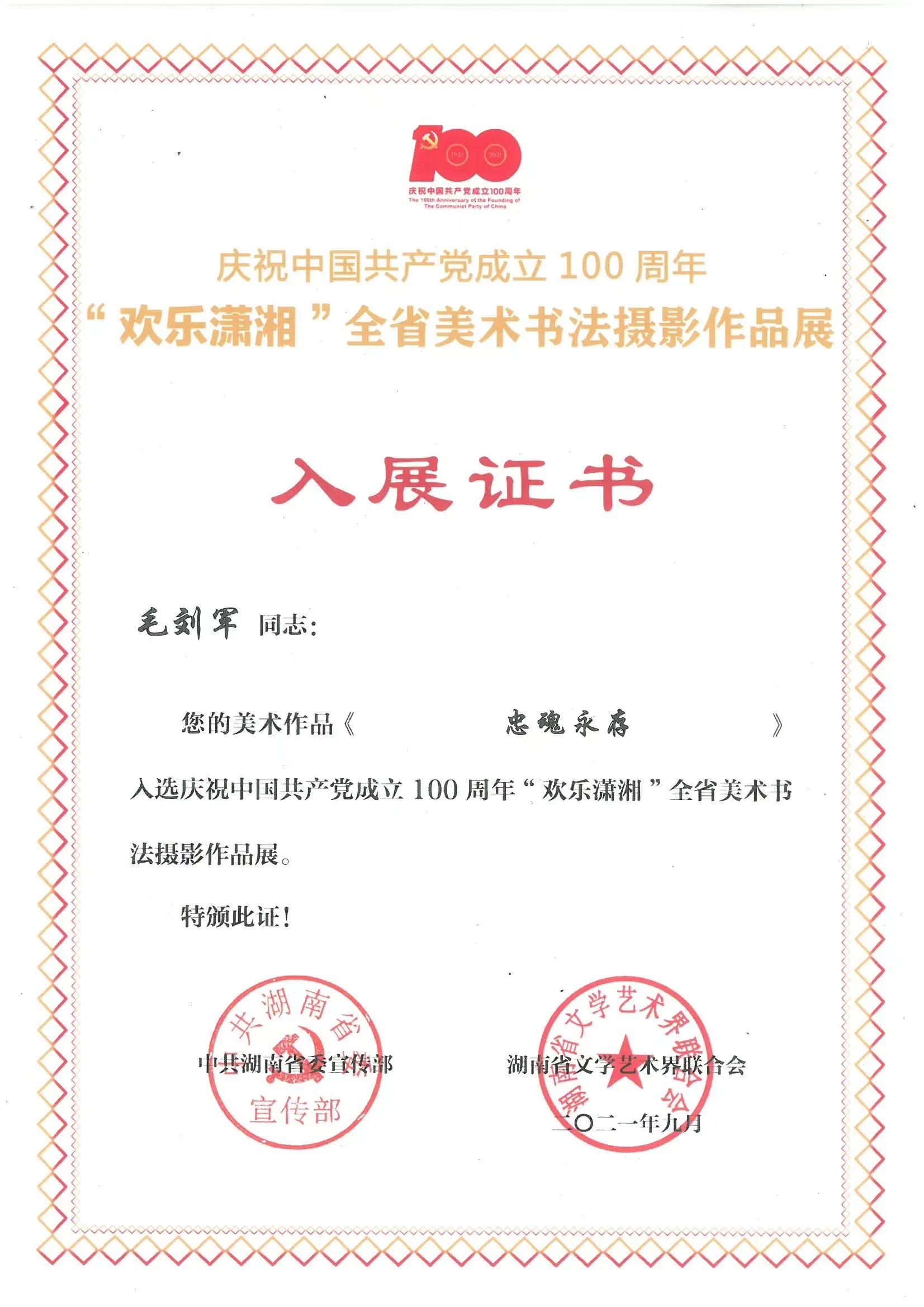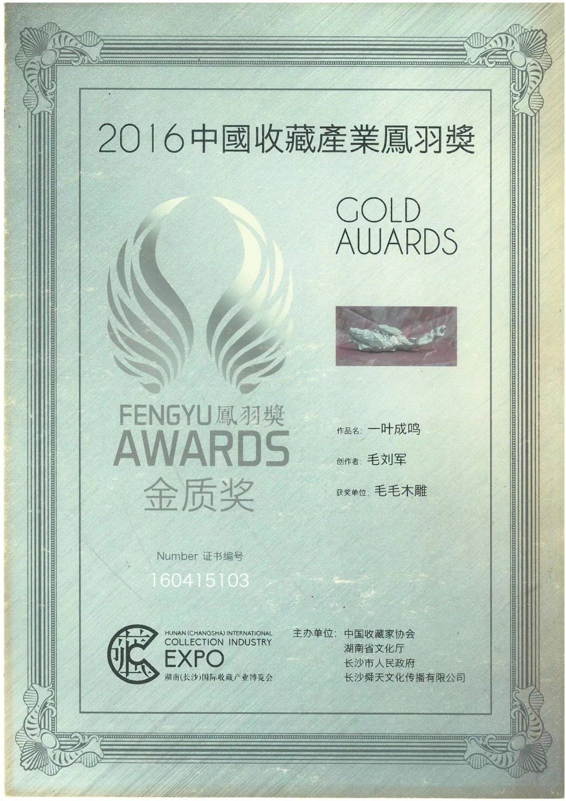 2016年,毛刘军第一次尝试着参加国家的相关技艺大赛,他携带自己的作品《一叶成鸣》参加了被誉为中国收藏产业“奥斯卡”的“凤羽奖”评选,获得全国金奖。