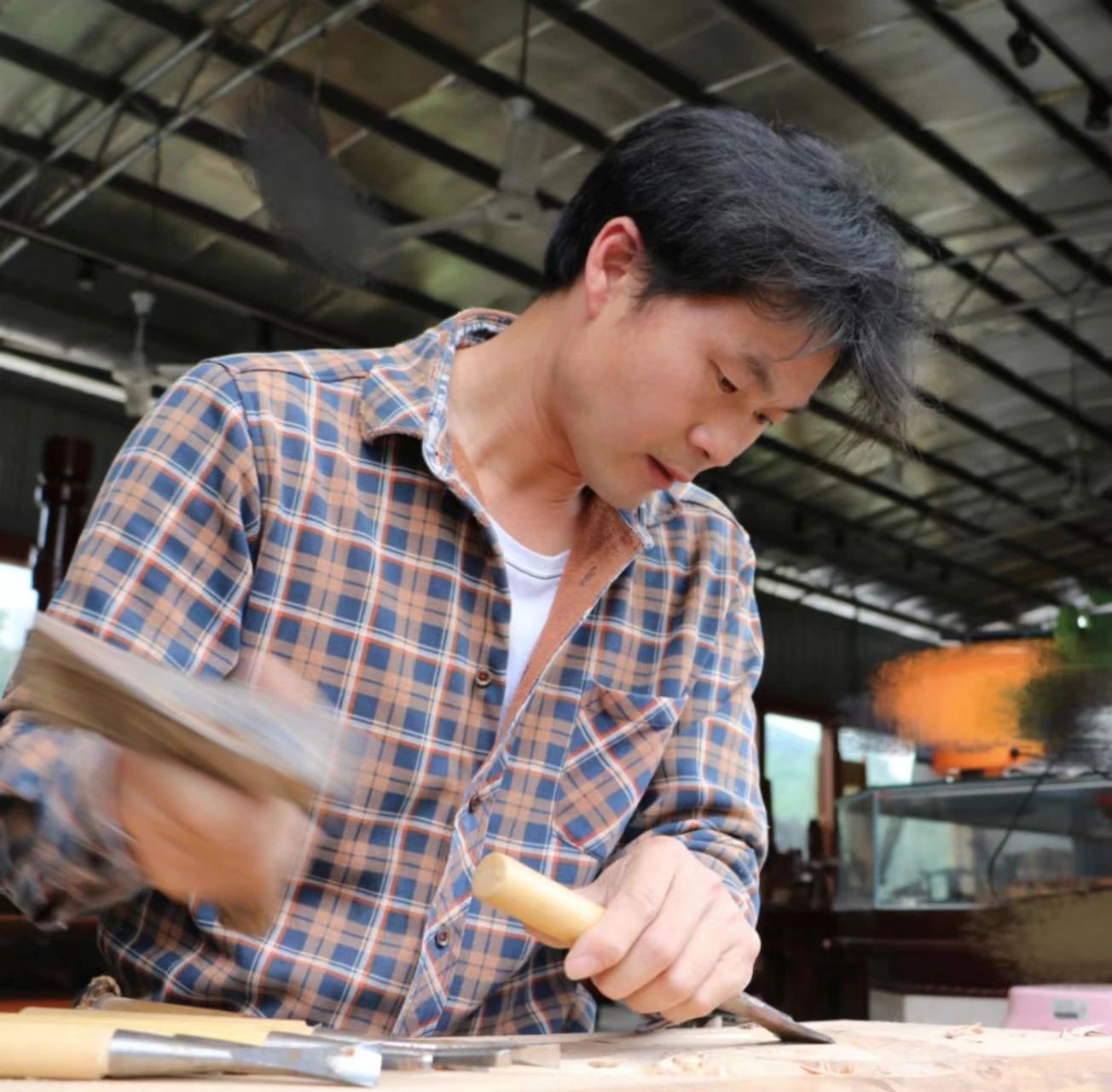 往后的十余年里,毛刘军左手持雕刻刀,右手紧握木槌,每天凿刻着木板,日复一日,慢慢的,他从“小学徒”变成了“大师兄”,他的手艺也从小山村传扬到全国各地。此时,他已经凭着自己精湛的手艺实现了“过上好生活”的梦想。