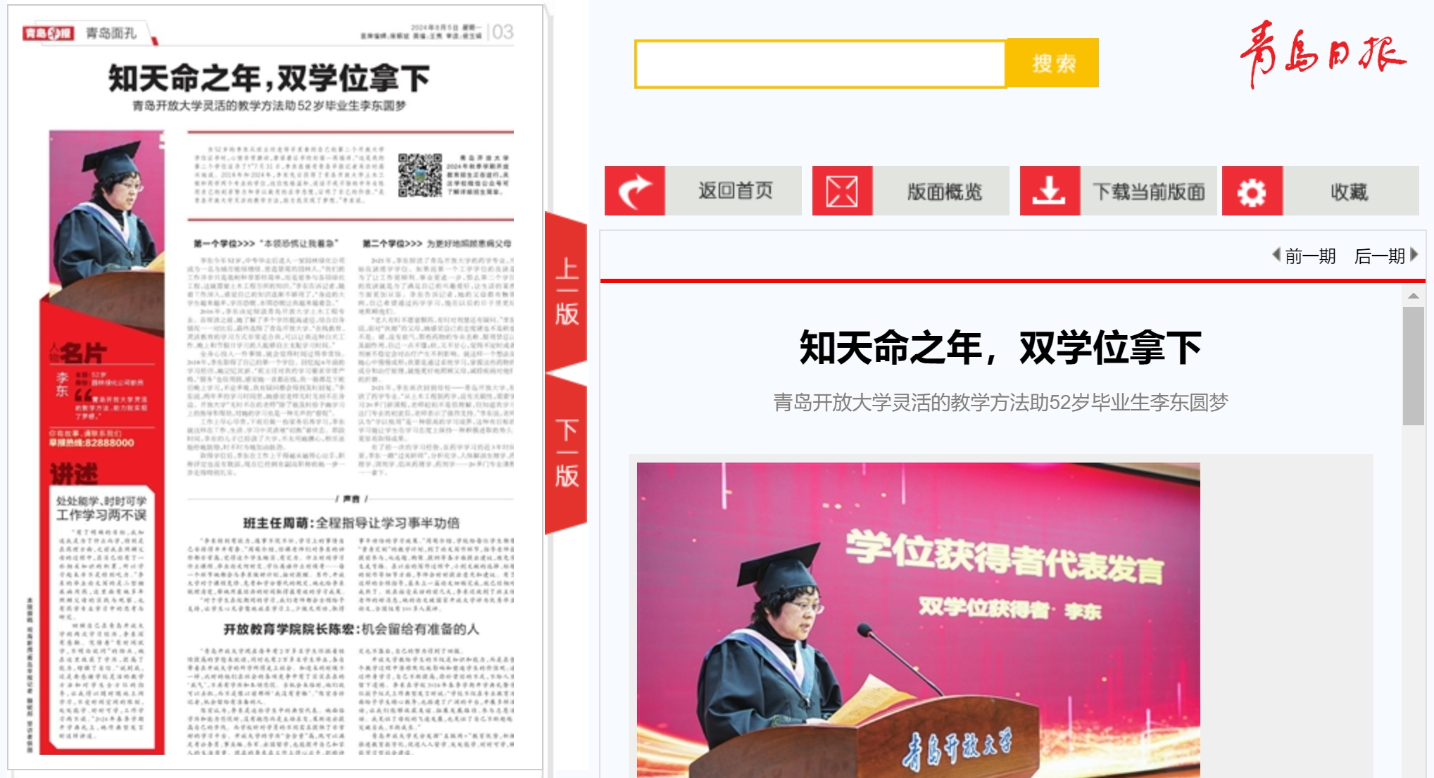 当52岁的李东从班主任老师手里拿到自己的第二个开放大学学位证书时,心情非常激动,摩挲着证书的封面一再端详。“这是我的第二个学位证书了!”7月31日,李东在接受青岛早报记者采访时高兴地说。2018年和2024年,李东先后获得了青岛开放大学土木工程和药学两个专业的学位,这位性格温和、说话不疾不徐的中年女性用自己的刻苦努力和学以致用的求学态度,证明了自己的价值。“是青岛开放大学灵活的教学方法,助力我实现了梦想。”李东说。
