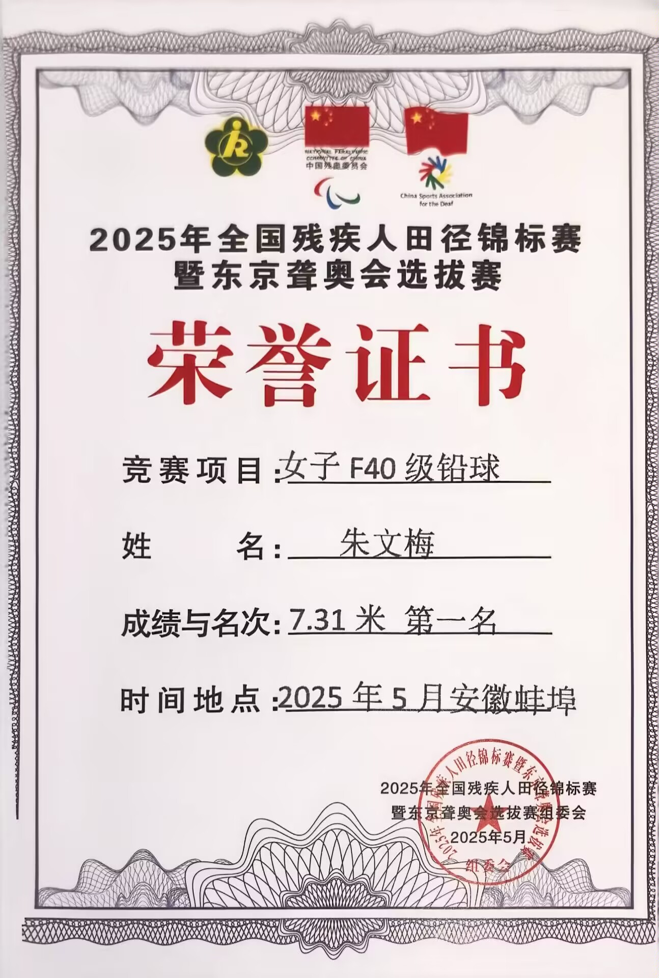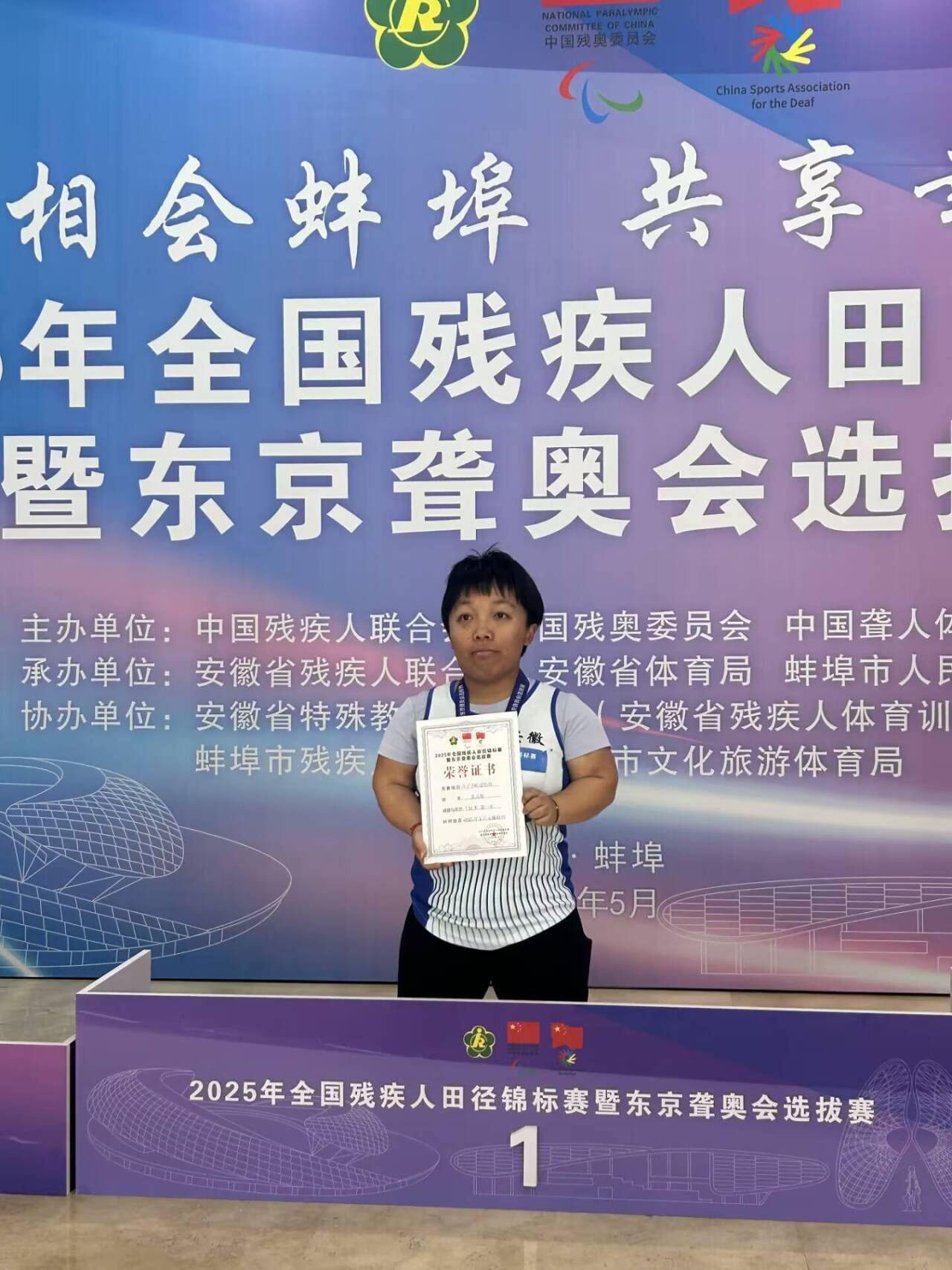 近日,2025年全国残疾人田径锦标赛暨东京聋奥会选拔赛在安徽省蚌埠市圆满落幕,来自残疾人教育学院合肥学习中心2024级社会工作专业本科学生朱文梅在女子 F40 级铅球项目中脱颖而出,勇夺第一名。
