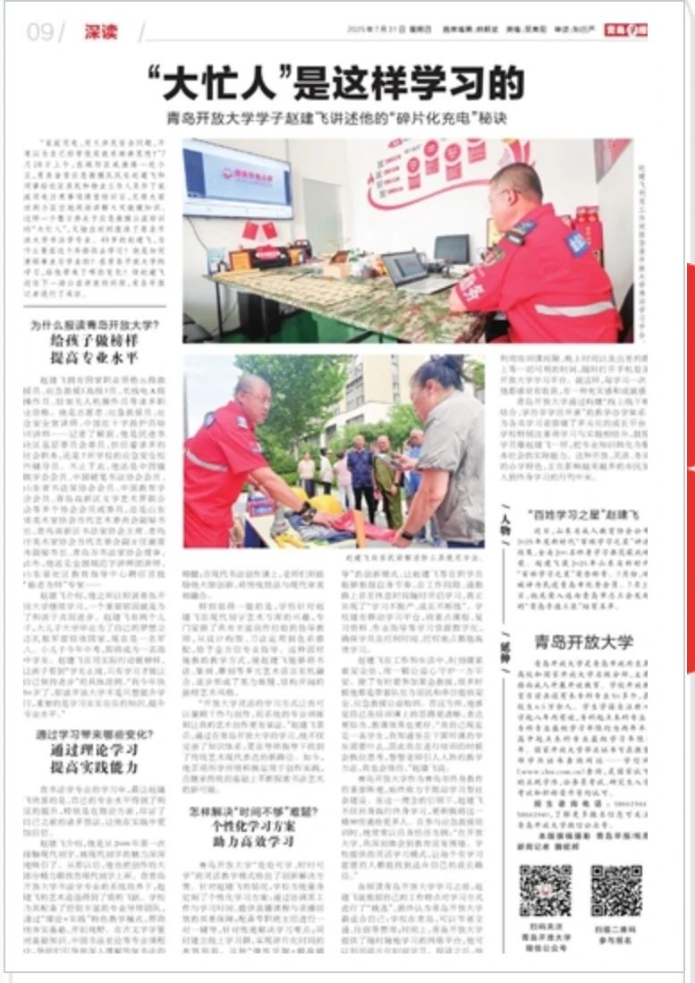 青岛开放大学通过构建“线上线下相结合、学历非学历并重”的教学办学体系,为各类学习者搭建了多元化的成长平台。学校特别注重将学习与实践相结合,鼓励学员像赵建飞一样,把专业知识转化为服务社会的实际能力。这种开放、灵活、务实的办学特色,正在影响越来越多的市民加入到终身学习的行列中来。