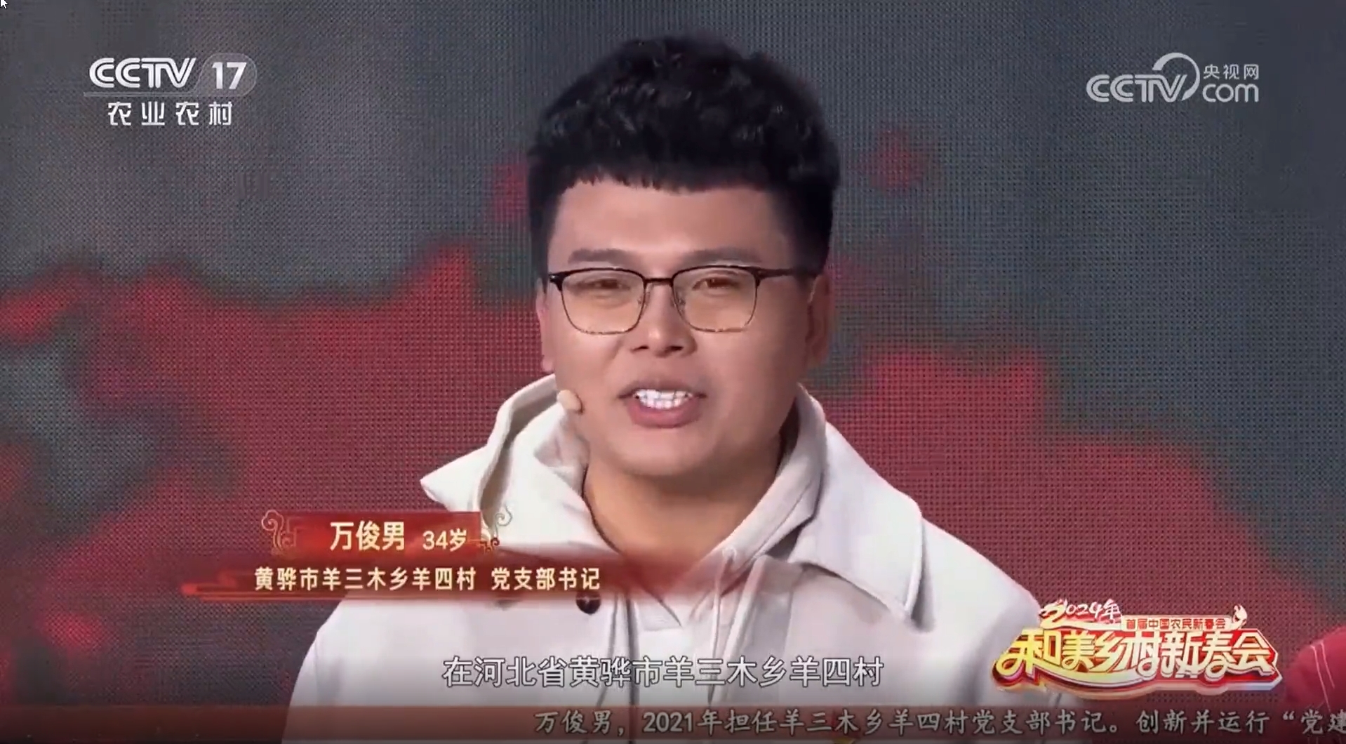 万俊男是沧州开放大学2021级行政管理专业(本科)学生,目前在读,现任河北省第十四届人大代表、政协黄骅市第九届委员、黄骅市羊三木乡羊四村党支部书记、团支部书记、村主任。在他的带领下羊四村先后被评为“先进基层党组织”“村级廉政示范村”“党员党性教育基地”“文明乡村”等荣誉称号。春节期间,万俊男作为受邀嘉宾登上了中央电视台首届中国农民新春会《和美乡村新春会》的舞台,讲述其用党建引领乡村振兴的奋斗故事。