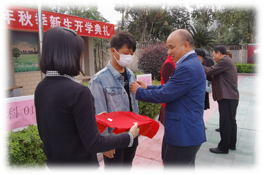 每年春秋两季,开展新生入学仪式,观看“开学第一课”。将爱国元素融入开学典礼,新生“和国旗同框”,师生合唱《歌唱祖国》。通过给新生佩戴校徽,传递学生证,开展老生带新生活动,还有新生宣誓、优秀学生表彰、优秀校友事迹介绍等环节,帮助同学们凝聚集体意识。在仪式上,为帮助困难家庭学生顺利入学,解决生活问题,学校予以减免了部分学费,让新同学无后顾之忧,安心学习。此外,为鼓励师生积极践行绿色生活方式,大力弘扬艰苦奋斗精神,帮助同学们树立起“节约粮食,拒绝浪费”的正确观念,深入推进制止餐饮浪费教育。2020年秋季的新生开学典礼上,由优秀校友邓歆做了主题发言,在迎新现场还摆放了“拒绝舌尖上的浪费光盘行动你我同行”条幅,同学们纷纷积极参与,主动签名。