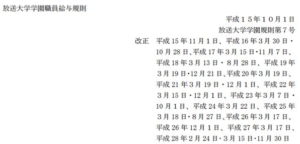 从上图可以看出,“放送大学教职员工薪酬制度”于2003年10月1日颁布,为放送大学第7号规则。该制度从颁布之日起,前后经历了25次修正。由此可以看出,放送大学能够根据实际发展的变化,及时修正相关管理制度,这是提高管理效率的诀窍之一。