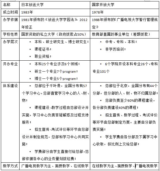 国家开放大学的前身是中央广播电视大学,成立于1978年,总部位于北京,是教育部直属事业单位。日本放送大学是由日本政府出资建设的新型大学,由日本文部科学省主管。为了更有效地学习借鉴,在此对国家开放大学和日本放送大学做简单的比较。具体见表1。