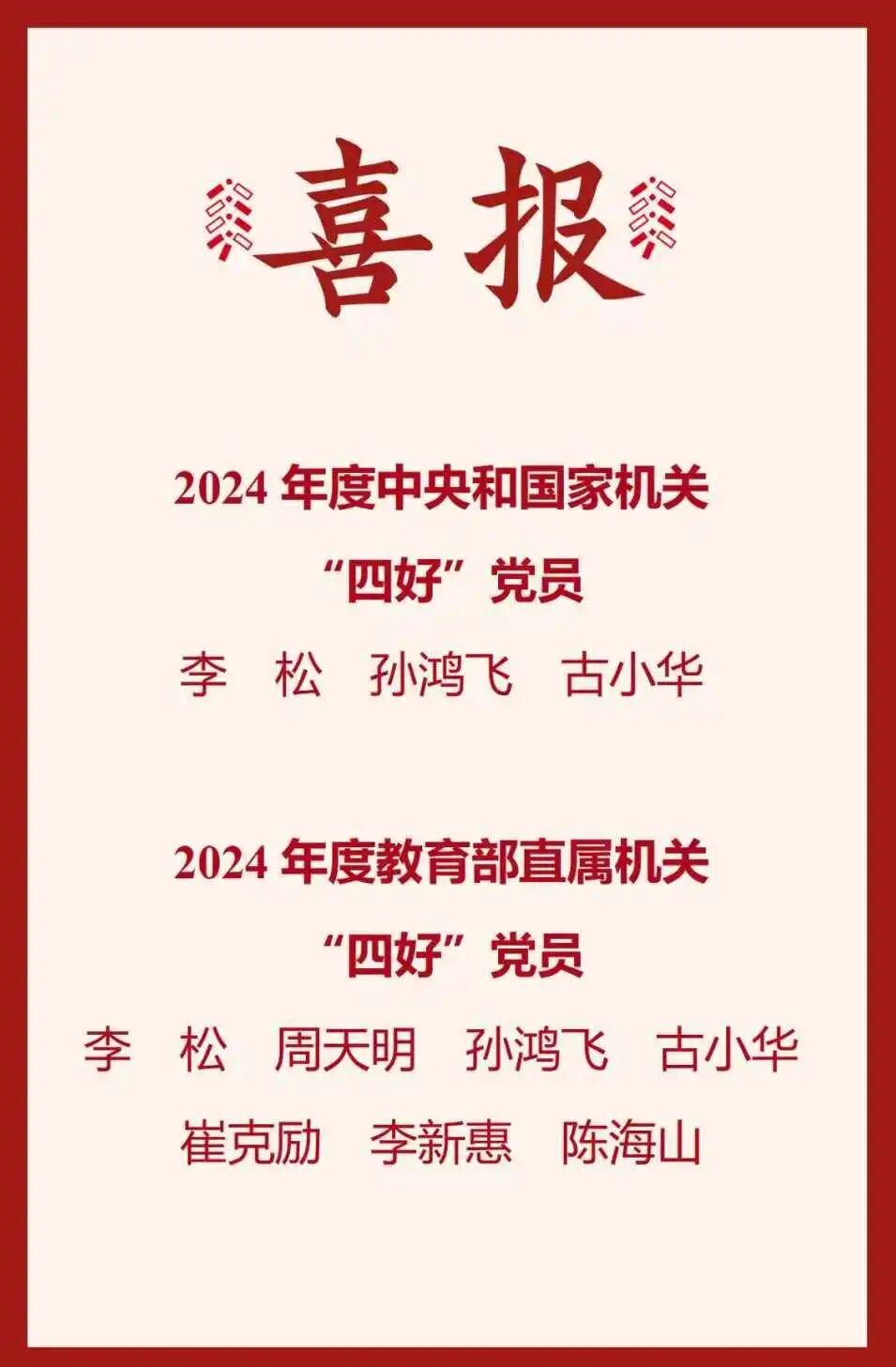 近日,教育部直属机关党委印发《关于评定2024年度直属机关“四好”党员的决定及获评中央和国家机关“四好”党员有关情况的通报》,国家开放大学3名党员获评2024年度中央和国家机关“四好”党员,7名党员获评2024年度教育部直属机关“四好”党员。