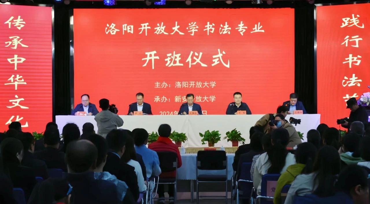 近日,洛阳开放大学在中国书法之乡——新安县举办首届书法本科班开班仪式暨“洛•学堂”全民终身学习大讲堂。国家开放大学特聘教授庞中华,河南开放大学党委副书记王继东,洛阳开放大学党委书记李欣,以及新安县领导班子成员王智、王晓辉,国家开放大学艺术学院书法专业教师王少凡等出席活动。洛阳开放大学2024年秋季书法专业新生及当地书法爱好者等200余人参加。开班仪式由李欣主持。