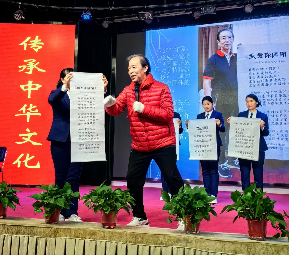 仪式结束后,庞中华教授作专题讲座。他结合自己的学书经历,深入浅出地讲解了《庞中华的快乐速成学习方法》,鼓励学生要不断积累,勤奋练习。在场学生积极上台参与教学互动,并得到庞中华教授的悉心指导。他拉起手风琴,讲授书法与音乐的关系,让现场观众沉浸式体验了一场书法盛宴。