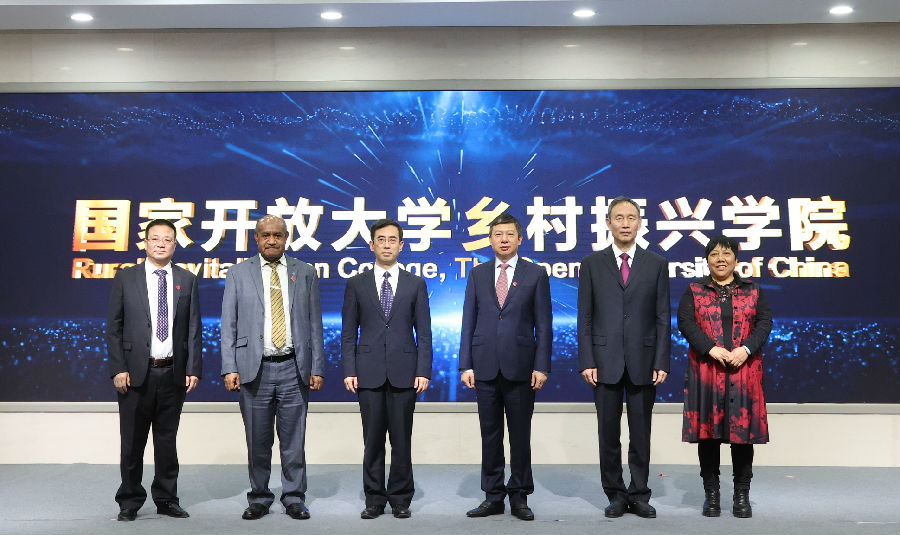 会上,秦昌威、裴伯庸、荆德刚、鞠传进、杨孝堂和龙四清为国家开放大学乡村振兴学院揭牌。(摄影:张骏 翁建斌)