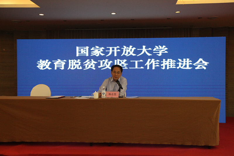杨志坚作题为《提高政治站位,凝聚体系力量,对表对标聚焦,助力脱贫攻坚工作》的工作报告。他充分肯定了过去几年国家开放大学教育扶贫工作取得的成绩。主要表现在:一是根据中央和教育部党组总体部署和要求,围绕“三区三州”深度贫困地区开展的扶贫攻坚工作;二是根据教育部党组关于滇西以及青龙、威县等脱贫总体部署和要求开展的教育扶贫攻坚工作;三是围绕国家开放大学“长征带”教育精准扶贫工程以及在通辽市开展的教育扶贫工作。