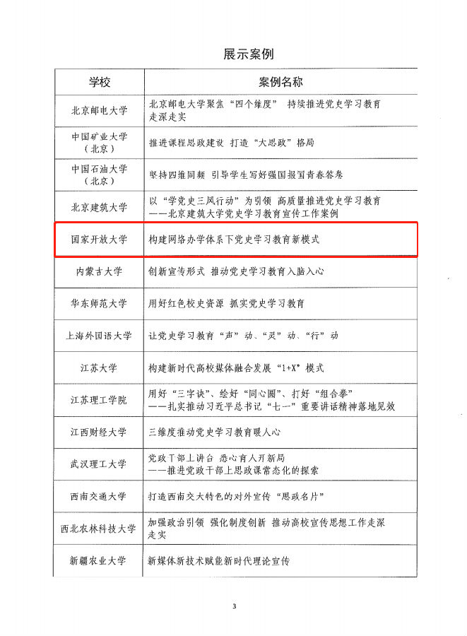 近日,中国高等教育学会宣传工作研究分会公布了第四届高校宣传工作创新案例名单,国家开放大学报送的《构建网络办学体系下党史学习教育新模式》,被评为第四届高校宣传工作创新案例展示案例,这是国家开放大学连续两年获得此项荣誉。