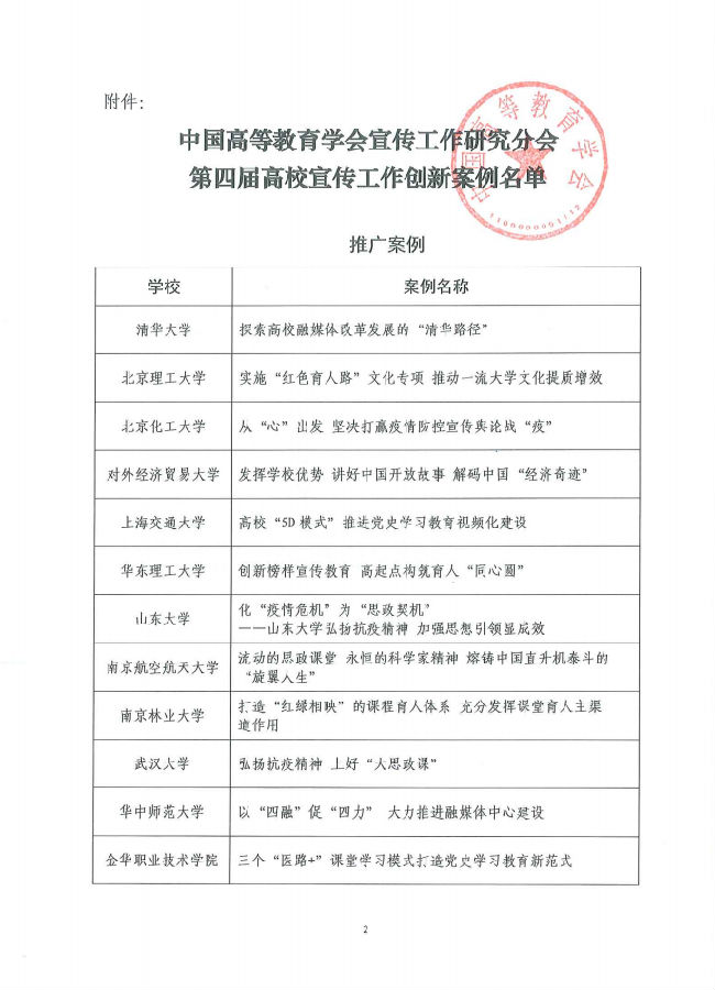 为深入学习贯彻习近平新时代中国特色社会主义思想,集聚高校宣传思想工作队伍理论成果与工作经验,充分发挥推进高校宣传思想工作交流、创新、发展的平台作用,中国高等教育学会宣传工作研究分会组织开展了第四届高校宣传工作创新案例征集推广展示活动,为高校宣传思想工作守正创新归纳总结新做法、新经验、新举措,形成了一批特色鲜明的创新工作案例。经各校自主申报、分会组织专家审核,此次共收录了12项推广案例、15项展示案例。