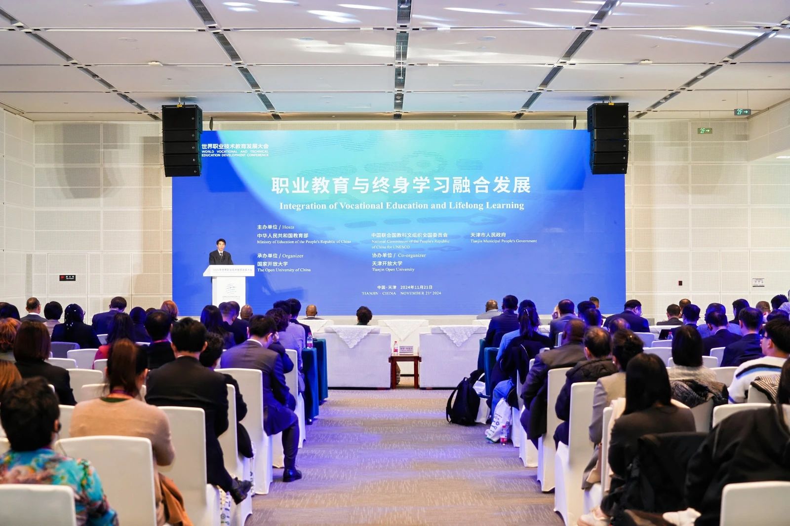 11月21日,2024世界职业技术教育发展大会开幕,同期,“职业教育与终身学习融合发展”平行会议在天津召开。来自全球11个国家和地区的政府官员、国际组织代表、教育界专家学者,以及来自7所中国职业院校的书记、校长,共计200余人参会。会议由国家开放大学党委书记、校长王启明主持。