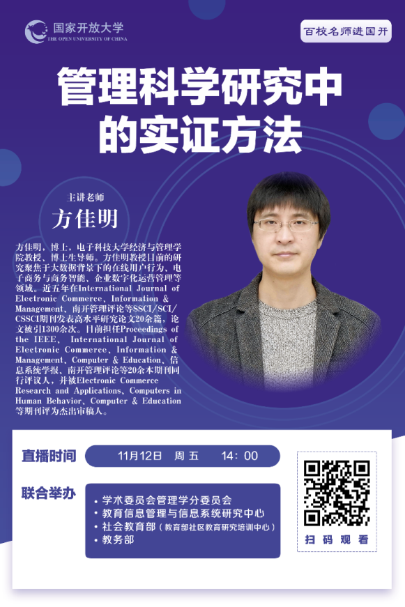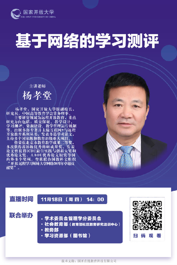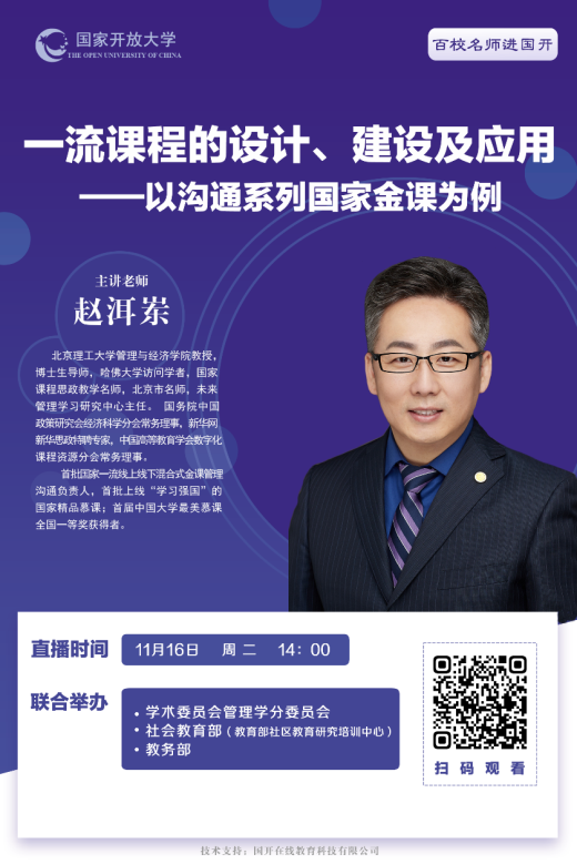 根据《国家开放大学学术委员会章程》,为加强管理学分委员会建设,进一步推动国家开放大学管理学科专业发展以及实证研究开展,服务办学体系教学改革、课程建设和学科研究水平提升,国家开放大学学术委员会管理学分委员会将于2021年11月—12月期间,以线上与线下结合的方式组织开展系列学术研讨交流活动。11月11日,首场讲座“新时期开放大学课程建设的思考与实践”学术研讨交流活动举办,国家开放大学副校长、学术委员会主任李松教授出席活动并致辞。