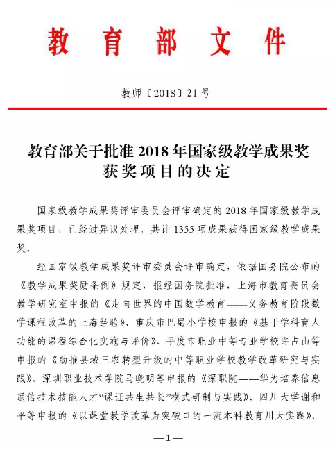 国家级教学成果奖是我国教育领域中唯一的一项国家级奖励,与国家自然科学奖、技术发明奖、科学技术进步奖并称为我国四大国家级奖励,代表了我国教育教学工作的最高水平。国家级教学成果奖每4年评选一次,分为基础教育、职业教育、高等教育3个大类,分别设置特等奖2项、一等奖50项、二等奖400项。职业教育国家级教学成果奖代表了当前我国职业教育工作的最高水平,是彰显学校人才培养工作水平和教育教学改革创新成效的核心指标,受到职业教育界的高度重视。
