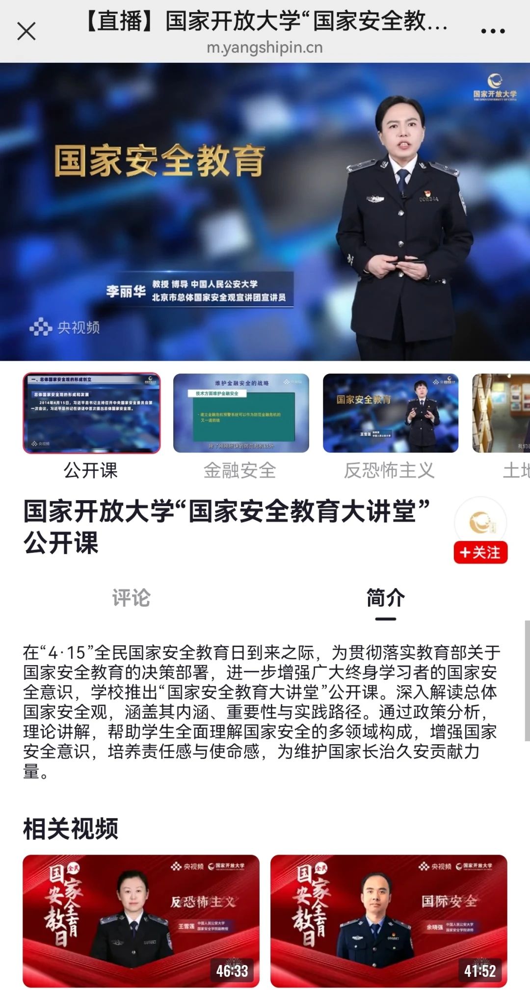 学校还联合“央视频”,通过国家终身教育智慧教育平台,以直播方式,面向全国普通高校学生、国家开放大学学生,以及所有社会学习者推出“国开大讲堂·国家安全教育公开课”,累计观看人数达56.1万人次。直播结束后,各分部、学院开展国家安全教育主题班会、主题讨论会、观后交流会等活动,部分学生还撰写了心得体会,取得了良好的学习效果。