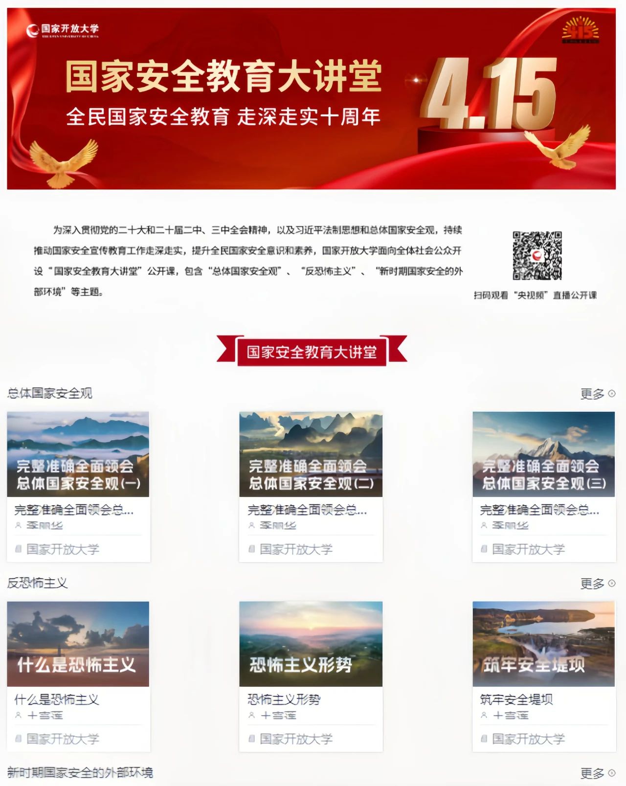 学校开设“国开大讲堂·国家安全教育公开课”系列课程,通过国家终身教育智慧教育平台向全国普通高校学生,以及所有社会学习者提供优质免费学习资源,截至4月21日,累计观看超过179.06万人次。