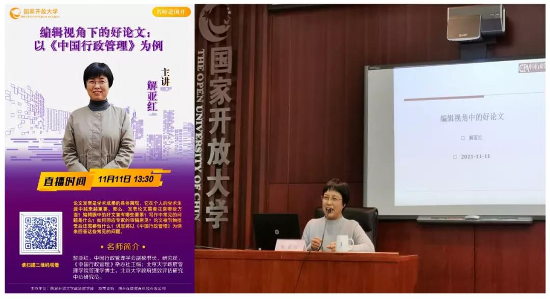 为进一步提高国家开放大学行政管理学科建设水平,丰富和活跃学校的学术氛围,政法教学部于2021年11月11日邀请中国行政管理学会副秘书长、中国行政管理杂志主编解亚红研究员为国家开放大学体系师生作了题为《编辑视角下的好论文》的专题讲座。国家开放大学副校长范贤睿出席讲座并讲话。国家开放大学政法教学部副部长、教务部副部长古小华主持活动。