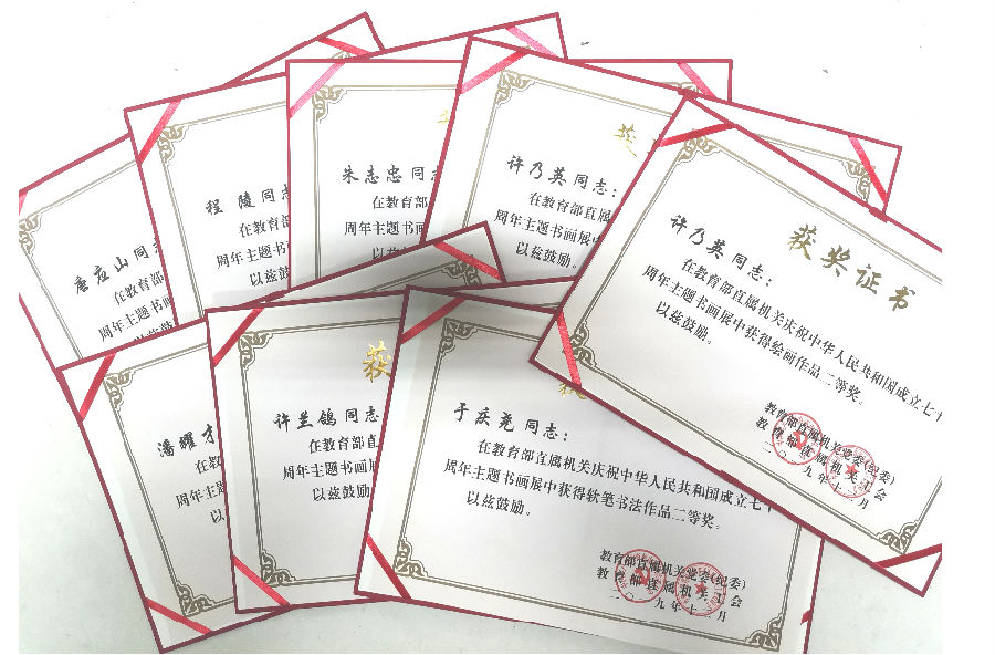 为庆祝中华人民共和国成立70周年,围绕“礼赞新中国 奋进新时代”和“中国梦、廉洁情、文化根”主题,教育部直属机关党委、直属机关纪委、直属机关工会组织开展了直属机关干部职工主题书画作品征集活动。活动共收到300余件作品,国家开放大学教职工积极参与,获一等奖3个、二等奖6个、三等奖1个、优秀奖1个。